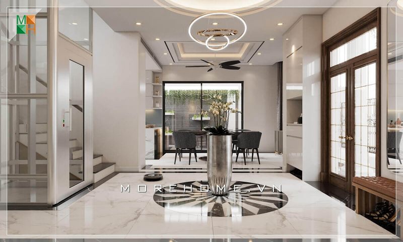Ấn tượng với mẫu thiết kế không gian sảnh biệt thự, nhà phố độc đáo và cao cấp, trang trí bình hoa khổng lồ giữa không gian sảnh tạo điểm nhấn sáng tạo cho không gian căn nhà thêm đẳng cấp.