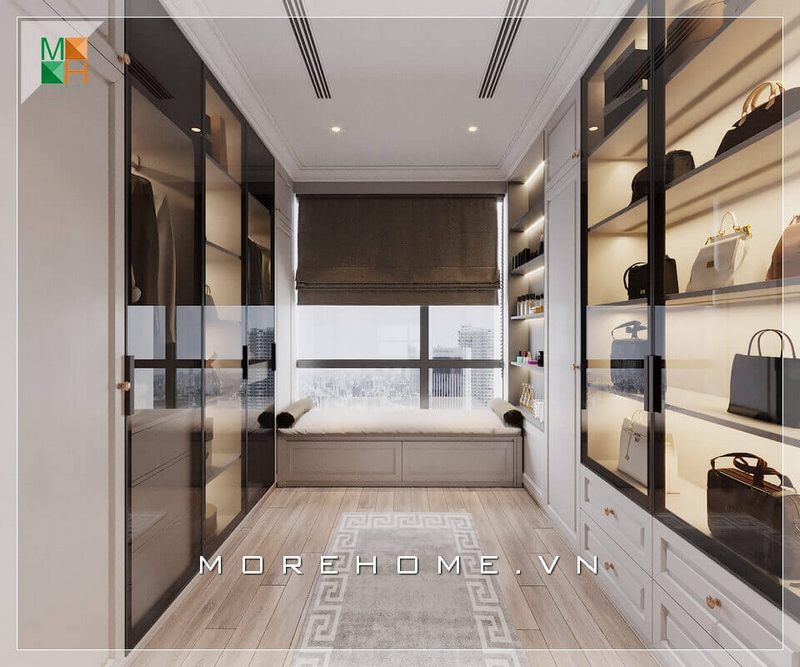 Hệ thống tủ quần áo và kệ tủ đều làm bằng gỗ sồi phun sơn trắng với những chi tiết góc cạnh tân cổ điển