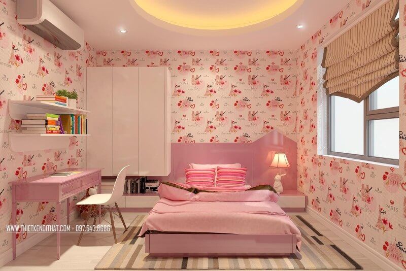 Mẫu thiết kế tủ quần áo hiện đại được thiết kế full trần mang đến vẻ đẹp sang trọng cho phòng ngủ bé gái