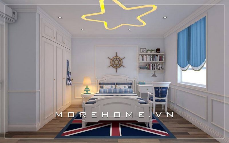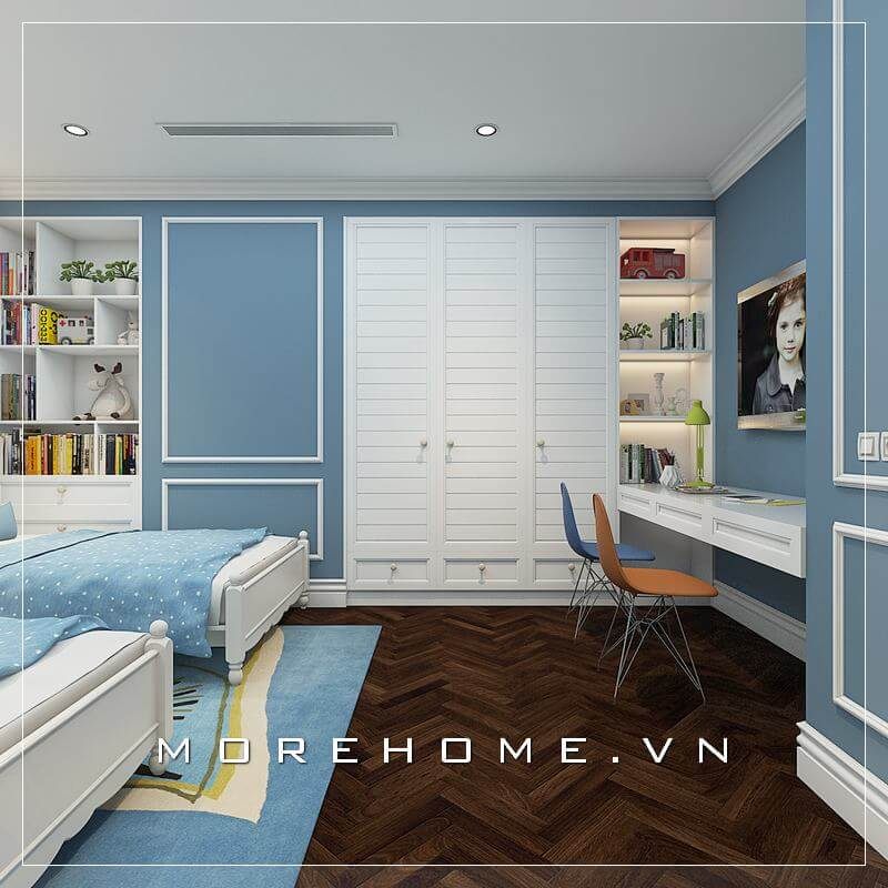 Nếu bạn đang lên ý tưởng cho phòng ngủ của 2 cậu con trai thì mẫu bố trí phòng ngủ tại biệt thự Vinhomes Imperia Hải Phòng là một gợi ý khá đẹp và khoa học, tủ quần áo màu trắng âm tường, kệ trang trí gắn tường và giường mô hình nhà đẹp mắt.