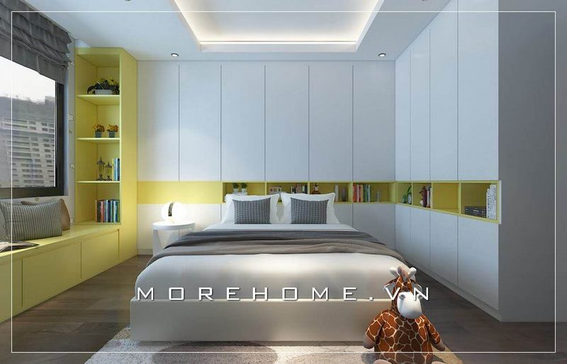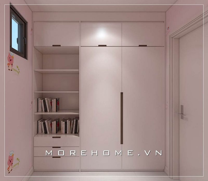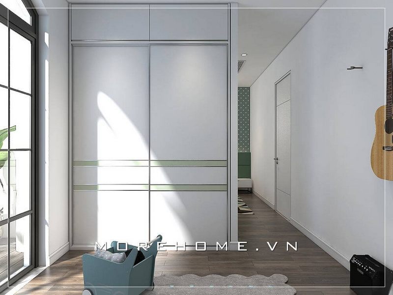 Tủ quần áo gỗ công nghiệp màu trắng chạm trần tại phòng ngủ của bé