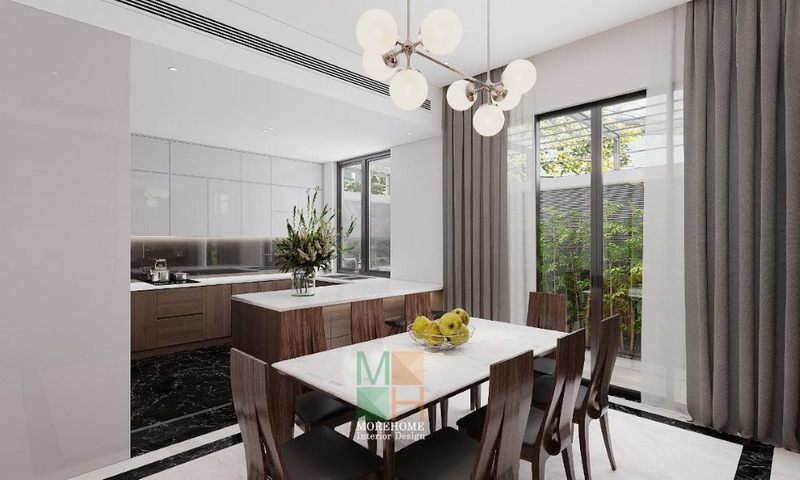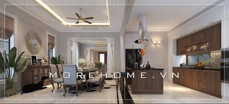 Mẫu tủ bếp gỗ công nghiệp hiện đại, tiện nghi cho phòng ăn biệt thự