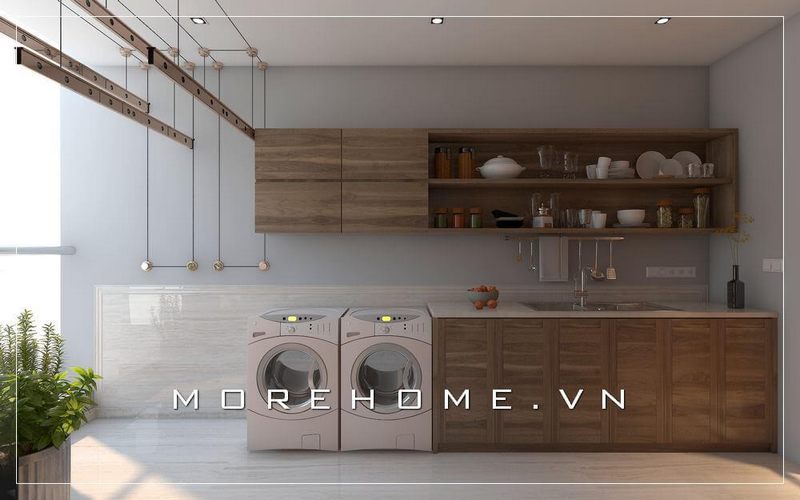 Morehome sử dụng thiết kế kệ tủ đơn giản đa ngăn, đảm bảo tính công năng và không làm ảnh hưởng đến diện tích sử dụng