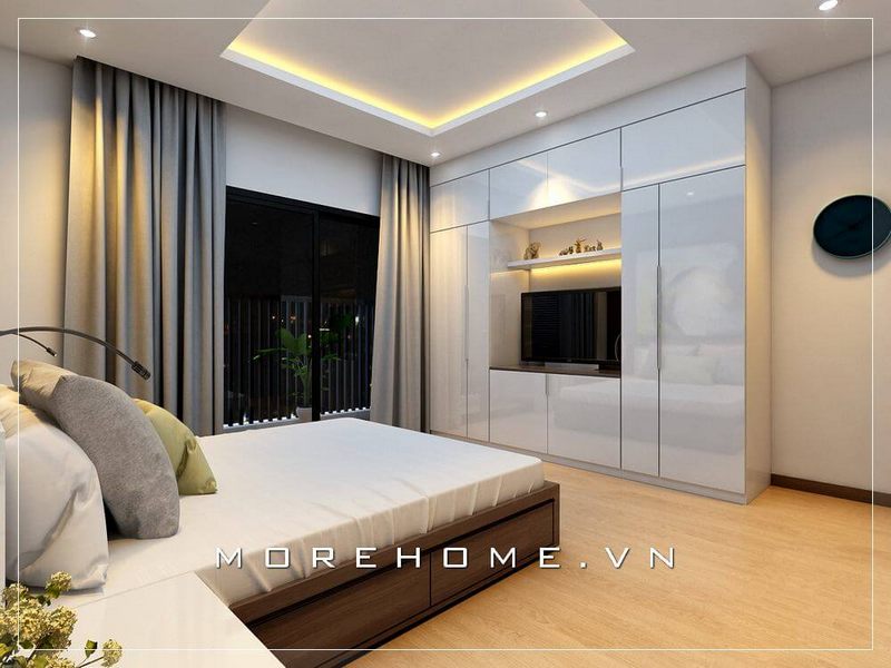 Tủ quần áo gỗ công nghiệp Acrylic bóng gương màu trắng sẽ góp phần tạo nên sự sang trọng, tiện nghi cho phòng ngủ chung cư hiện đại.