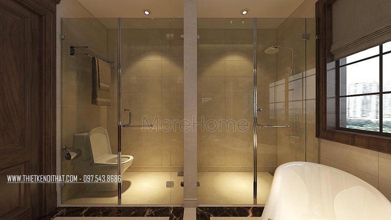 Phòng tắm với thiết kế hiện đại phân chia rõ ràng 2 khu vực phòng tắm đứng và nhà vệ sinh tránh ảnh hưởng từ không gian này với không gian khác tạo sự riêng tư thông thoáng, khô ráo.