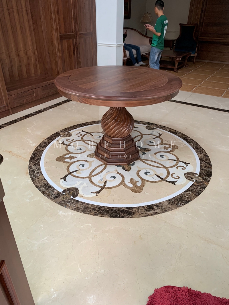 Đá tự nhiên được lát thành hình hoa văn tròn tinh xảo, phù hợp với yêu cầu kiến trúc không gian và phong cách của công trình.