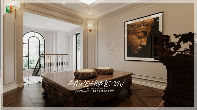 Mẫu thiết kế nội thất phòng thờ bằng gỗ óc chó tự nhiên nhập khẩu được thể hiện rất tỉ mỉ và tinh tế, góp phần tạo nên sự sang trọng cho không gian phòng thờ.